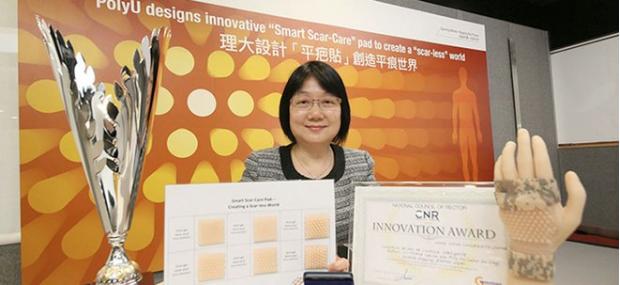理大康复科学系李培贞教授设计的智能疤痕护理垫,旨在将压力治疗和硅胶凝胶对瘢痕治疗的影响结合起来。它由硅胶加强筋和医用级硅胶片组成。硅胶加强件由硅橡胶制成。其光滑的一面附着在有机硅凝胶片上,用来滋润疤痕。硅胶加强件的另一侧的特征在于圆形硅胶螺柱,可以调节成弯曲或平坦的皮肤表面,以在弹性绷带或压力衣服下提供均匀的压力。