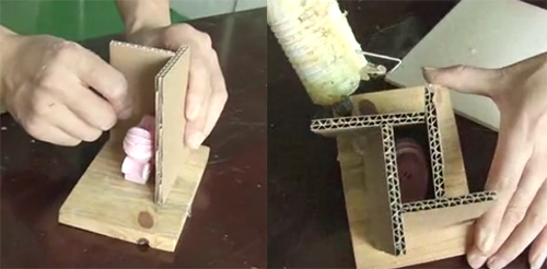 (2) 把蜡烛母模固定在木板上,裁切出四块梯形硬纸板,围在它的四周,形成下宽上窄的梯形形状(纸板与蜡烛之间的距离大概5mm左右),再用热熔胶密封纸板与木板,纸板与纸板间的缝隙。