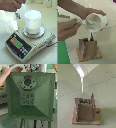 (2) 把硅胶模具以下宽上窄的形式固定在木板上,再其周围围上木板,木板与硅胶模具之间距离大概5mm左右,用热熔胶密封木板间的缝隙。