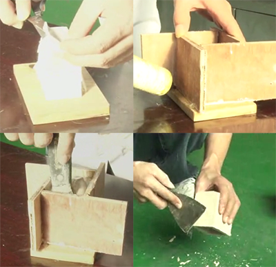 (3) 往木板围成的槽内倒入调好的石膏浆,倒的过程中,铲刀在槽中反复上下移动,使石膏浆完全注满木槽缝隙。