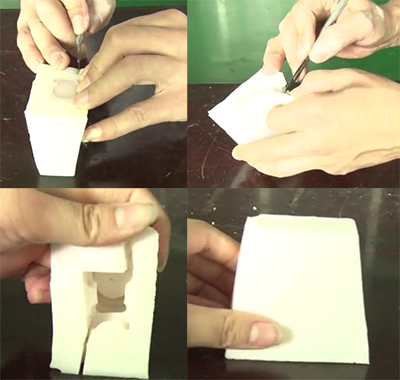 (4) 待石膏完全固化后(不同的石膏型号,固化时间不同),便可拆除木板;取出石膏外膜后,用铲刀把石膏四边修整磨平。