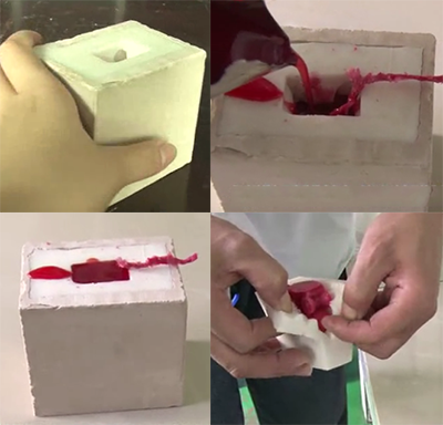PS:分模线是为了方便脱模;分模线要切成锯齿状,便于后续生产使用中硅胶模具的咬合。硅胶模具放置24小时后便可投入生产使用。