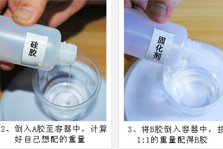 ①将称量好的硅胶与固化剂倒在同一容器混合。②一定要充分搅拌均匀,否则会部分固化部分不固化,影响翻模次数。