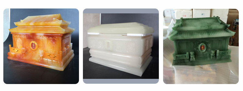 仿玉石骨灰盒模具硅胶一般采用的是缩合型模具硅胶,也有客户喜欢用加成型模具硅胶,两者均为双组份硅胶,液体硅橡胶; A 组份是可流动性的液体硅胶,B 组份是固化剂(硫化剂),二者混合后能快速成型。其中,缩合型硅胶为非食品级,也就是工业级硅胶,加成型硅胶为食品级硅胶。下述推荐的是缩合型模具硅胶。